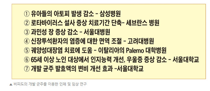 다른 마이크로바이옴 회사들과 비교하여 비피도는 국내 유수의 대학병원들과 공동연구를 통하여 핵심균주인 비피더스균 BGN4, BORI, AD011 등에 대한 250편의 SCI논문과 약 100 건의 특허 실적을 보유하고 있는데 글로벌하게 보아도 이렇게 많은 근거를 확보한 균주는 흔하지 않다. 주요 임상실적은 아래와 같다.