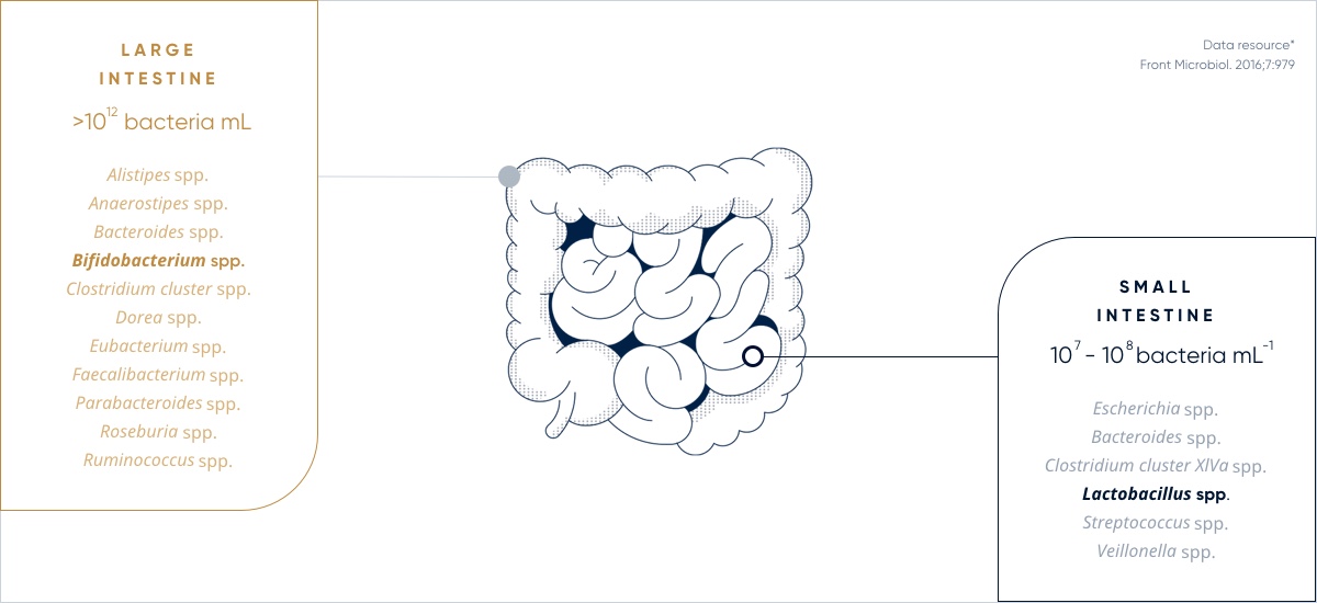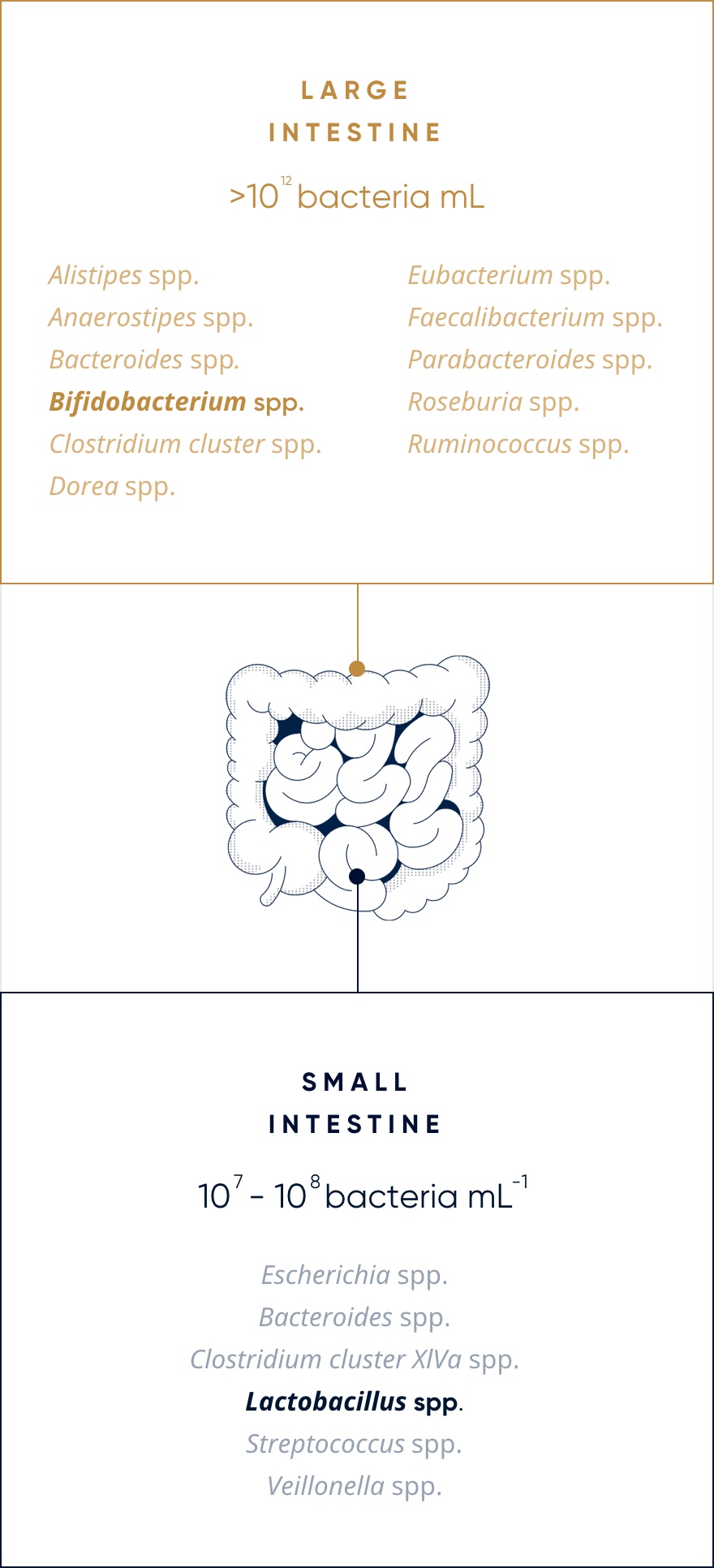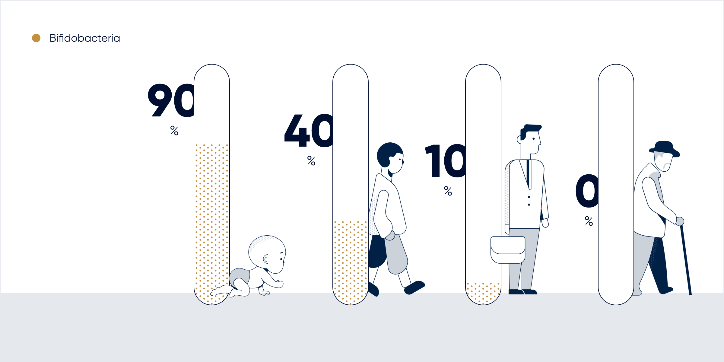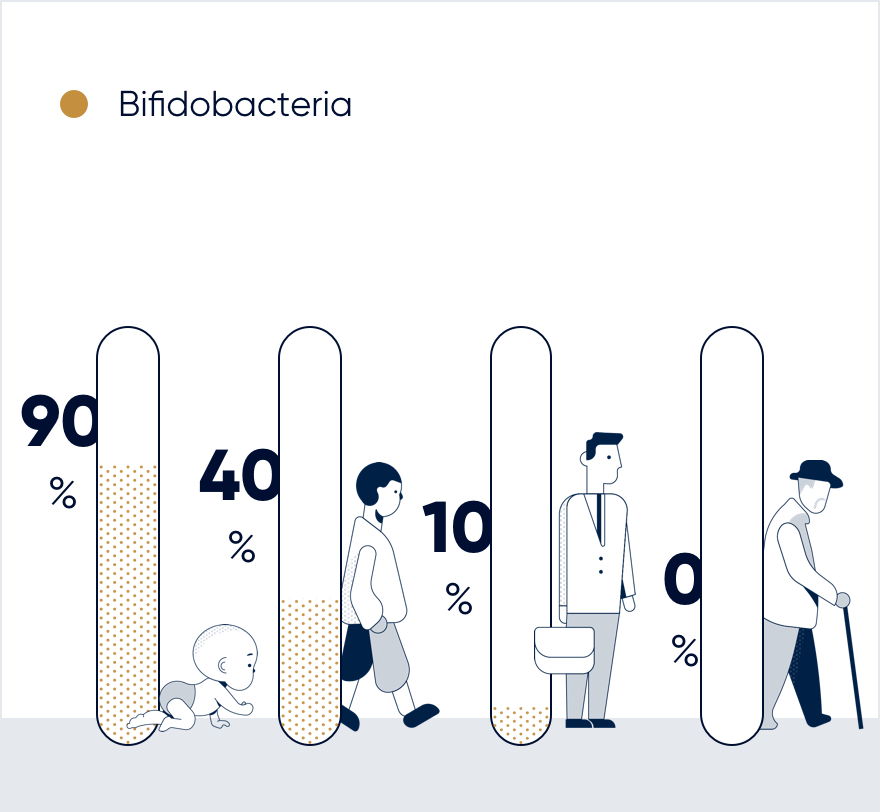 건강한 모유 수유 유아들에서는 장내 세균의 90% 이상이 비피도박테리움으로 이들은 감염 예방과 유아의 건강 유지에 도움을 주고 있습니다. 하지만 이들 유익한 박테리아는 나이가 들면서 지속적으로 감소하게 됩니다.